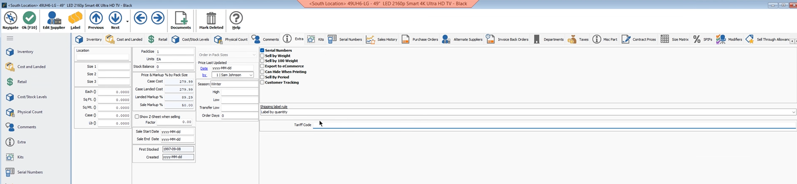 - Inventory Details Window: Enter the applicable tariff code in the Tariff Code text box.